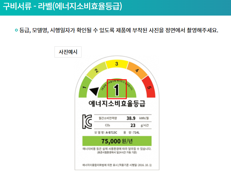 - 라벨은 에너지 효율등급이 표시되어 있는 라벨을 뜻하고 아래 사진 참고하셔서 촬영하시면 될 것 같아요!